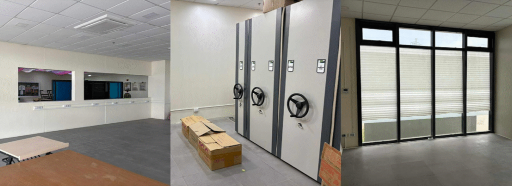 The new Registrar’s Office is set for guaranteed completion within the month of October. Partitions, paintworks, and main electrical installations are now finished. Security is ensured with the installation of doors and locksets, securing the important student files located in the vault room. Only the transaction window is pending delivery and installation, which is expected shortly.